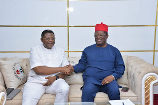 Works Minister, Senator David Umahi and the Cross Rivers State Gov, Senator Bassey Etu during his visit to the Minister on Monday. |